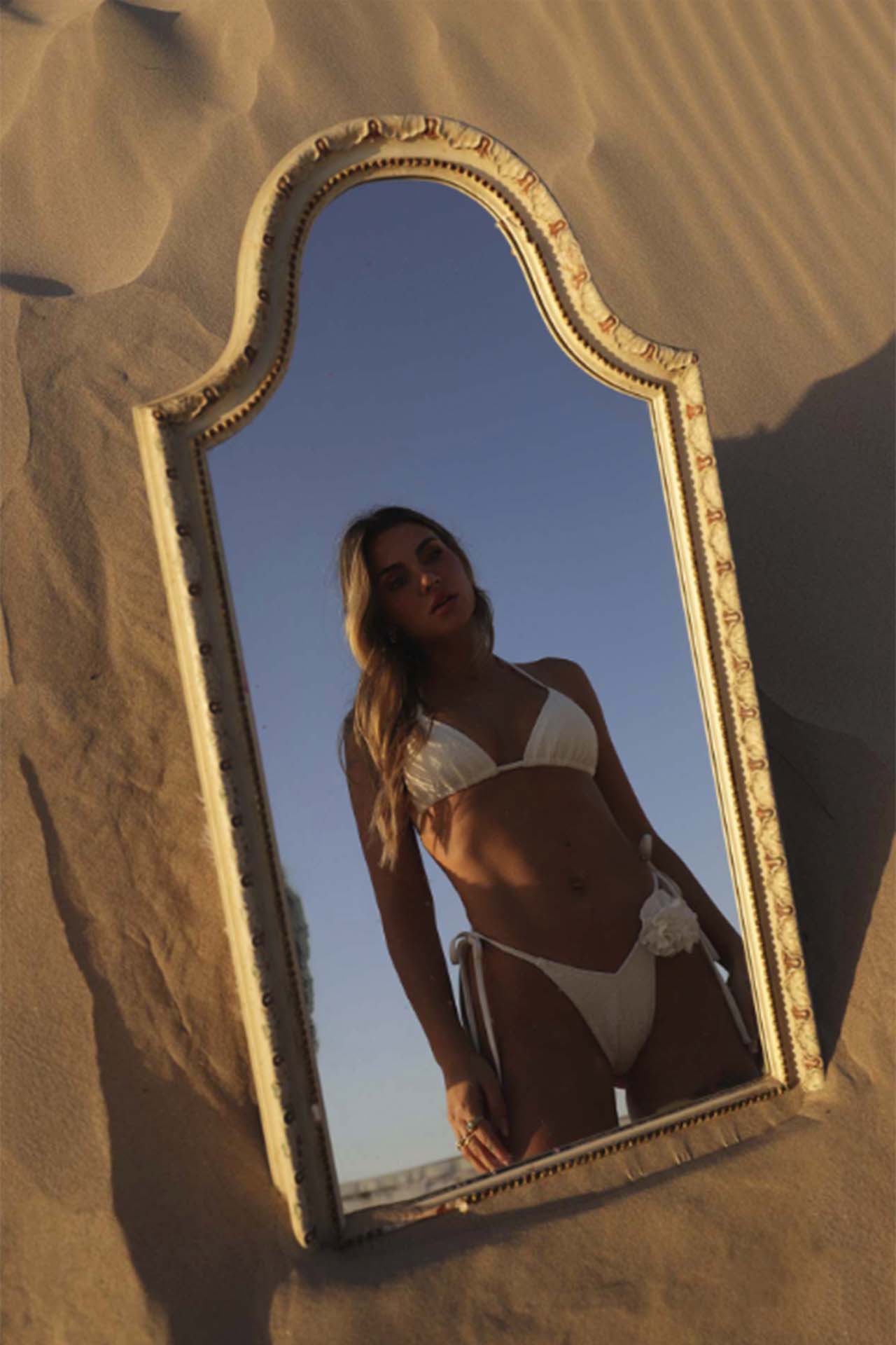 Angel Energy é um bikini com tecido branco texturado. É ideal para um bronzeado com uma marca pequena. Possui o fitting perfeito. Não possui copa. A rosa apresentada na imagem é apenas uma sugestão de adereço que se pode aplicar, mas apenas é enviado o bikini. É um dos modelos da nossa Linha Essential. Conhece mais opções de swimwear aqui