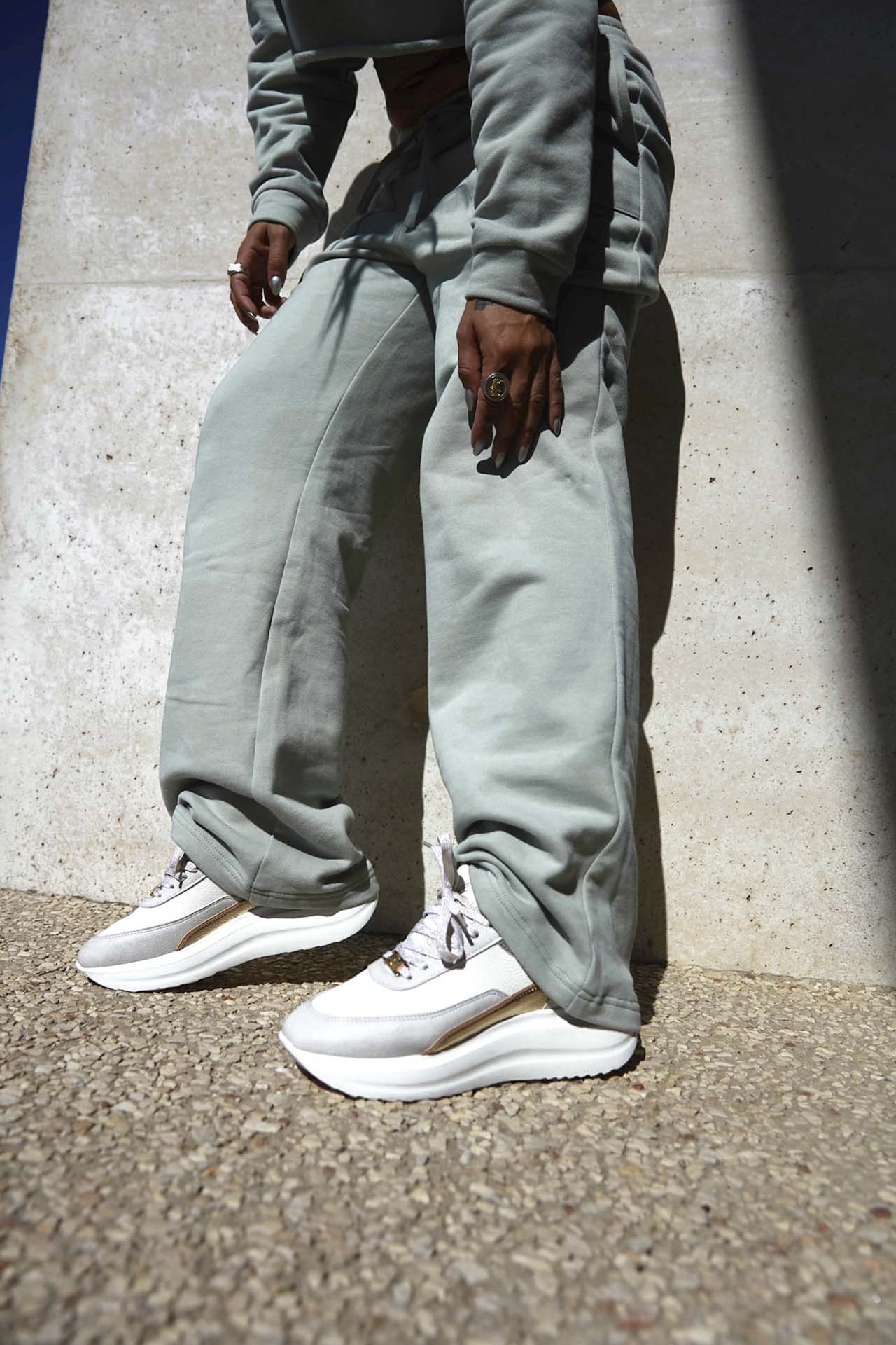 Cushy Aqua Pants são umas calças cardadas em verde água. São um modelo largo e possui dois bolsos. É a peça ideal para os looks de inverno por ser quente, confortável e prática.